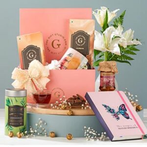 This hamper is perfect for employees who enjoy a blend of gourmet treats, self-care, and productivity tools.