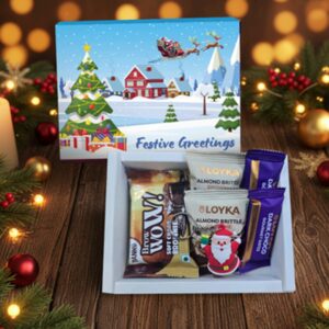 A festive gourmet delight packed with indulgent treats, including dates, brownie, almond brittle brownie, and a cute Christmas keychain. This premium gifting box is a perfect blend of sweetness and celebration.