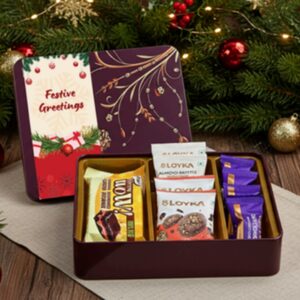 A luxurious tin filled with brownies, caramel brownies, chocolate cookies, and choco dates. A great gift choice for those who enjoy rich, flavourful treats during the holidays.