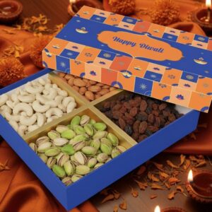 • Almonds, Cashews, Pistachios & Raisins – 100gm each. A timeless classic in elegant festive packaging.