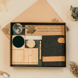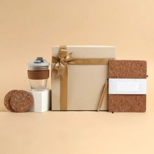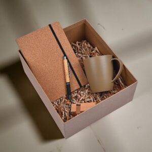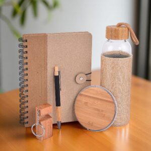 Features a Natura Mug, bamboo keychain, cork notebook, and bamboo pen — designed for smart, eco workspace gifting.