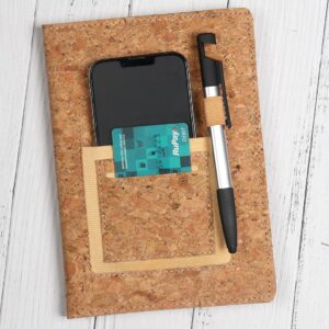 A versatile 3-in-1 cork notebook featuring a mobile holder pocket, pen loop, and card slot — perfect for professionals on the go.