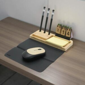 A bamboo desk organizer featuring a foldable mouse pad, perpetual calendar, mobile stand, and sticky notes holder — everything in one place.