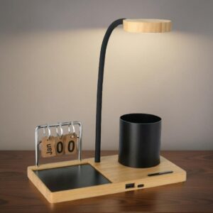 Includes a wireless charging hub, flexible desk lamp, stationery stand, perpetual calendar, and ceramic mug with coaster.